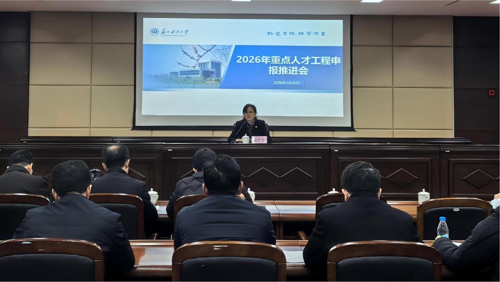 2026年1月25日下午,苏州科技大学于石湖校区一楼学术报告厅组织召开2026年度重点人才工程申报推进会。校长顾菊平出席会议并发表讲话,人事处处长徐本连主持会议,各教学单位主要负责人参加此次会议。